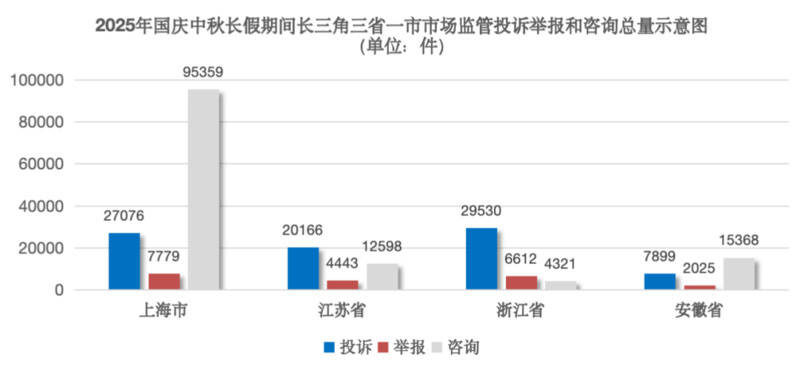Core Insights - The report highlights that during the 2025 National Day and Mid-Autumn Festival holiday, the Yangtze River Delta region's market supervision departments enhanced complaint handling and consumer protection efforts, resulting in a significant number of complaints and inquiries [1][3] Group 1: Complaint Statistics - A total of 84,671 complaints were received, 20,859 reports were registered, and 127,646 inquiries were answered across the three provinces and one city during the holiday [1][3] - Shanghai received 27,076 complaints, 7,779 reports, and answered 95,359 inquiries; Jiangsu received 20,166 complaints, 4,443 reports, and answered 12,598 inquiries; Zhejiang received 29,530 complaints, 6,612 reports, and answered 4,321 inquiries; Anhui received 7,899 complaints, 2,025 reports, and answered 15,368 inquiries [3] Group 2: Consumer Behavior Insights - Online consumption complaints accounted for 78% of total complaints, while offline consumption complaints made up 22% [3] - The main industries involved in complaints included clothing and footwear, food, household goods, catering and accommodation services, and sales services [3] Group 3: Issues Identified - The primary issues reported were related to after-sales service, product quality, contract fulfillment, and unfair competition [3] - The market supervision departments are implementing measures to optimize the consumption environment, enhance consumer rights protection, and improve consumption order [3]