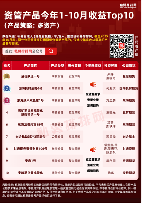 Core Insights - The asset management market is highly competitive, with 352 products showcasing performance as of October 2025, according to data from Private Placement Network [1] - Jin Xin Futures' "Jin Xin Jump One Asset Management Plan" has emerged as the top performer in the multi-asset product strategy category, outperforming various public funds and licensed financial institutions [1][4] Performance Rankings - As of October 2025, Jin Xin Jump One is ranked first among multi-asset strategies, demonstrating exceptional performance in a crowded market [2] - The product has consistently ranked in the top three of its category since October 2024, indicating stable returns and effective asset allocation strategies [4] Investment Strategy - The core investment philosophy of Jin Xin Jump One revolves around "macro game," focusing on macroeconomic analysis and market dynamics for asset and strategy allocation [6] - The product team aims to discover investment opportunities in complex market environments, utilizing a dynamic approach to adjust allocations across stocks, bonds, and commodities [6]