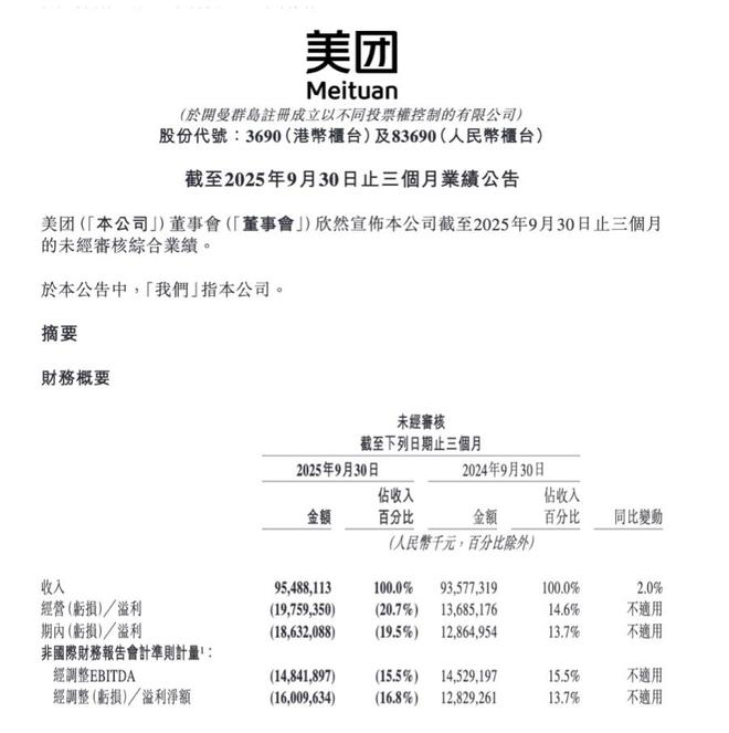11月28日下午消息,美团(HKEX:3690)今日发布了截至9月30日的2025年第三季度财报:营收为955 亿元,同比增长2.0%。净亏损186亿元,而2024年同期净利润129亿元;调整后的净亏损为160亿元,而 2024年同期净利润为128亿元。 专题:聚焦2025年第三季度美股财报 责任编辑:刘明亮 ...