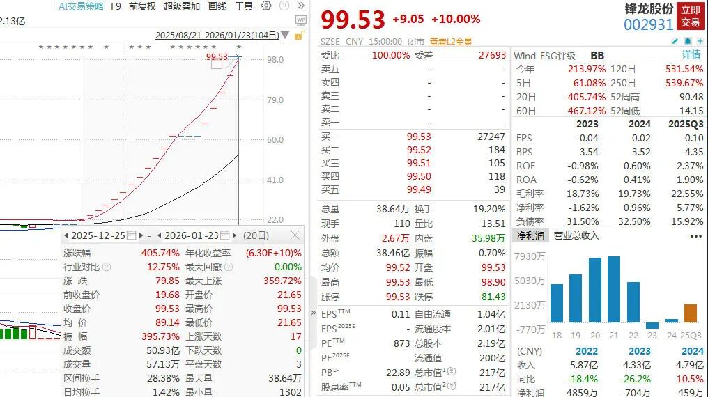 18连板锋龙股份 20天涨超400% 1月23日晚,深交所发布监管动态表示,深交所本周共对326起证券异常交易行为采取了自律监管措施,涉及盘中拉抬打压、虚假申报等异常交易情形;对 因涉嫌财务数据存在虚假记载被中国证监会立案的"*ST立方(300344)""*ST长药(300391)"进行重点监控;共对6起上市公司重大事项进行核查,并上 报证监会1起涉嫌违法违规案件线索。 深交所提到,近期"锋龙股份(002931)"股价出现严重异常波动,公司停牌核查并多次发布风险提示公告,复牌后股价连续涨停,部分投资者在交易该股 过程中存在影响股票交易正常秩序的异常交易行为,本所依规对相关投资者采取了暂停交易等自律监管措施。 1月23日,锋龙股份继续涨停,成交额放出巨量至38.46亿元,为上市以来新高,此前其成交金额最高不超过12亿元。 至此该股已斩获18连板,近20个交易日股价涨超400%,总市值217亿元。这样的连板数早已超越2025年"牛股之王"上纬新材的10连板纪录,成为当下市场 最耀眼的机器人概念股。 | 时间范围 3M | 6M | 18 H | 单位 | 万元 | > | ් පිට ចុះ | 周期 | 日 | ...