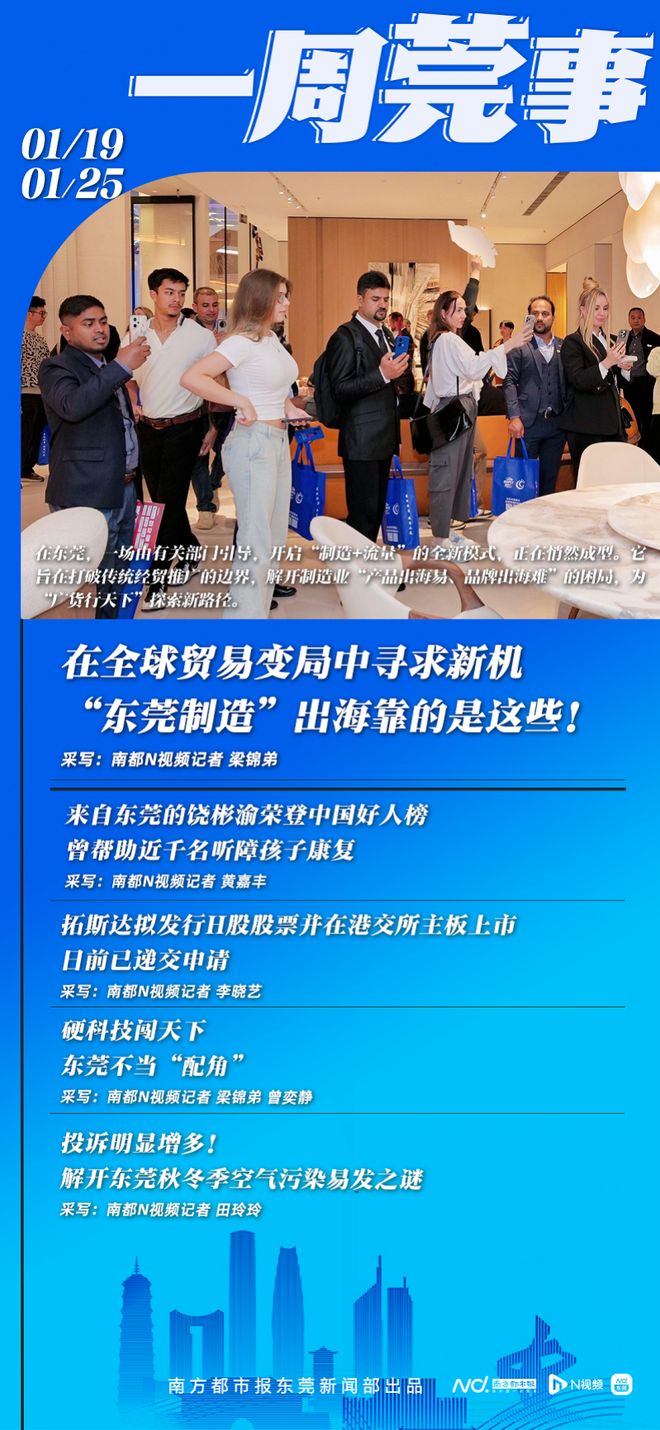 【东莞一周】 精选原创新闻合集 2026.01.19—2026.01.25 1 东莞出海新"战法":在全球贸易变局中主动破局 南都N视频记者 梁锦弟 全球贸易格局在变,东莞出海"战法"也在变。 迪宝鞋业的潮流鞋履、恩典皮具的精致箱包、珍葆电器的智能家电……这些带着东莞印记的产品,不再 只出现在国际展会的展台或外贸订单的货柜里,而是通过海外网红达人的镜头,亮相全球社交平台。 在东莞,一场由有关部门引导,开启"制造+流量"的全新模式,正在悄然成型。它旨在打破传统经贸推 广的边界,解开制造业"产品出海易、品牌出海难"的困局,为"广货行天下"探索新路径。 这一场新的尝试,既是制造业城市转型的探索,更是一座城市主动拥抱世界的姿态。 2 来自东莞的饶彬渝荣登中国好人榜,曾帮助近千名听障孩子康复 3 硬科技闯天下 东莞不当"配角" 南都N视频记者 梁锦弟 曾奕静 东莞正用实力证明:在大湾区创新版图里,它早已不是配角。近日《2025胡润中国独角兽毕业榜》首次 发布,全国共有796家这样的 "独角兽毕业生",加上此前发布的300多家在榜独角兽,全国这类高价值 企业超1100家。其中东莞独角兽毕业生有12家,在榜独角兽4家,总共 ...