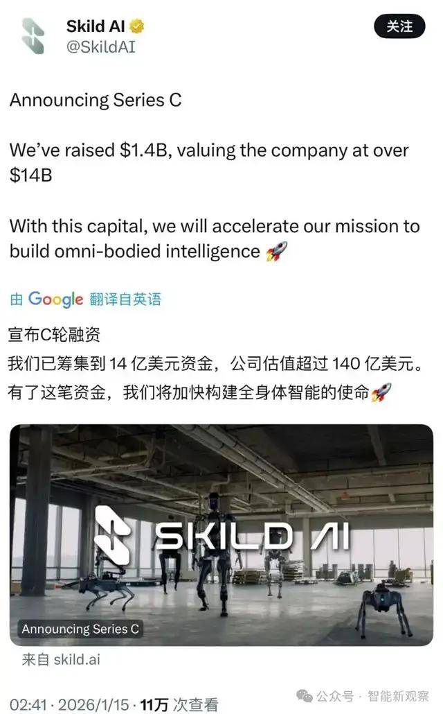 1月15日,机器人基础模型领域迎来里程碑事件。 美国初创公司Skild AI宣布完成约14亿美元C轮融资,估值飙升至超140亿美元,创下该领域融资纪录。 备受关注的是本次投资方的阵容:软银集团领投,英伟达、三星、LG、亚马逊创始人贝索斯家族办公 室、Salesforce等全球科技巨头罕见联手,形成跨越芯片、互联网、消费电子等多领域的投资联盟。 短短7个月内,Skild AI的估值增长超过200%,融资总额累计达20亿美元。这家2023年5月才成立的公 司,何以吸引全球顶级科技企业与投资机构集体下注? 一、创始团队:从学术殿堂到产业前沿的跨越 Skild AI的崛起与其创始团队的深厚背景密不可分。 公司由Deepak Pathak与Abhinav Gupta联合创立,二人均拥有卡内基梅隆大学机器人研究所的教授职 位,此前曾在Meta的先进机器人实验室共事。这种学术界+产业界的双重背景,为公司的技术路径选择 和商业化思维奠定了独特基础。 据公开资料显示,Pathak教授在机器人学习领域的研究成果颇丰,其关于自监督学习和强化学习的工作 在学术界具有广泛影响力。Gupta教授则长期专注于计算机视觉与机器人感知的交叉研 ...