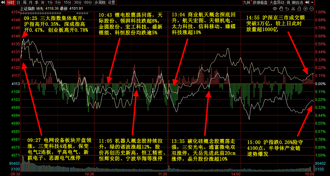 Market Overview - The overall market sentiment is low, with a day of shrinking fluctuations. The Shanghai Composite Index, Shenzhen Component Index, and ChiNext Index closed down by 0.26%, 0.18%, and 0.2% respectively, with total trading volume reaching 3 trillion [3]. Electric Grid Sector - The electric grid concept saw a strong opening after a surge in the previous afternoon, with stocks like Sanbian Technology, Baobian Electric, and Xinyuan Electronics opening at a high. However, most stocks experienced a significant drop after the initial surge, except for a few like Siyi Electric which managed to recover [6]. - The ultra-high voltage sector opened strong, rising over 5% before closing up by 2.79% [6]. Semiconductor Sector - The semiconductor sector showed strong performance, with stocks such as Kangqiang Electronics and Shenghui Integrated Circuit hitting the daily limit. The sector overall rose by 3.86% [8]. - The main catalysts for this surge included TSMC's impressive Q4 performance and future capital expenditures, along with price increases in the storage and packaging sectors [9]. High-Profile Stocks - High-profile stocks faced significant selling pressure, with companies like Haige Communication hitting the daily limit down. The market saw a lack of trading volume as aggressive funds were trapped in these stocks, leading to a further decline in trading activity [10]. - The market experienced a stark contrast in performance, with some stocks soaring while others plummeted, reflecting the volatility and unpredictability of the current trading environment [11]. AI Application Sector - Lio Co., a leader in AI applications, became a major factor in the decline of AI-related stocks after announcing a stock suspension due to significant price fluctuations. This led to a broader sell-off in the sector [12]. - The trading volume for Lio Co. reached 25.3 billion, indicating substantial capital was involved, which contributed to the market's overall volatility [12].