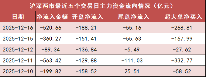 12月16日,A股市场整体下跌。 截至收盘,上证指数收报3824.81点,下跌1.11%;深证成指收报12914.67点,下跌1.51%;创业板指收报3071.76点,下跌2.1%。两市合计成交17241.73亿 元,较上一交易日减少492.66亿元。 1.两市主力资金净流出超520亿元 今日沪深两市主力资金开盘净流出188.21亿元,尾盘净流出55.16亿元,两市全天主力资金净流出520.66亿元。 | | | 沪深两市最近五个交易日主力资金流向情况(亿元) | | | | --- | --- | --- | --- | --- | | 日期 | | 净流入金额 开盘净流入 | 尾盘净流入 | 超大单净买入 | | 2025-12-16 | -520. 66 | -188. 21 | -55. 16 | -268. 81 | | 2025-12-15 | -360. 27 | -151.41 | -55. 63 | -167.99 | | 2025-12-12 | -89.34 | -136. 84 | -5.49 | -27. 62 | | 2025-12-11 | -563.42 | -129.88 | ...
