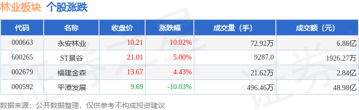 证券之星消息,11月24日林业板块较上一交易日下跌5.2%,平潭发展领跌。当日上证指数报收于 3836.77,上涨0.05%。深证成指报收于12585.08,上涨0.37%。林业板块个股涨跌见下表: | 代码 | 名称 | 收盘价 | 涨跌幅 | 成交量(手) | 成交额(元) | | --- | --- | --- | --- | --- | --- | | 000663 | 永安林业 | 10.21 | 10.02% | 72.92万 | 6.86 Z | | 600265 | ST景谷 | 21.01 | 5.00% | 9287.0 | 1926.27万 | | 002679 | 福建金森 | 13.67 | 4.43% | 21.62万 | 2.84亿 | | 000592 | 平潭发展 | 69'6 | -10.03% | 496.46万 | 48.98 7 | | 代码 | 名称 |主力净流入(元) | | | | 主力净占比 游资净流入(元) 游资净占比 散户净流入(元) 散户净占比 | | | | --- | --- | --- | --- | --- | --- | --- | --- | ...