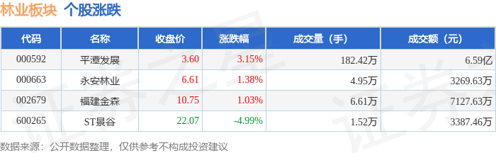 | 代码 | 名称 | 收盘价 | 涨跌幅 | 成交量(手) | 成交额(元) | | --- | --- | --- | --- | --- | --- | | 000592 | 平潭发展 | 3.60 | 3.15% | 182.42万 | 6.59亿 | | 000663 | 永安林业 | 6.61 | 1.38% | 4.95万 | 3269.63万 | | 002679 | 福建金森 | 10.75 | 1.03% | 6.61万 | 7127.63万 | | 600265 | ST景谷 | 22.07 | -4.99% | 1.52万 | 3387.46万 | 证券之星消息,10月10日林业板块较上一交易日上涨0.8%,平潭发展领涨。当日上证指数报收于 3897.03,下跌0.94%。深证成指报收于13355.42,下跌2.7%。林业板块个股涨跌见下表: 从资金流向上来看,当日林业板块主力资金净流入4598.27万元,游资资金净流出273.23万元,散户资金 净流出4325.05万元。林业板块个股资金流向见下表: 以上内容为证券之星据公开信息整理,由AI算法生成(网信算备3101043457103 ...