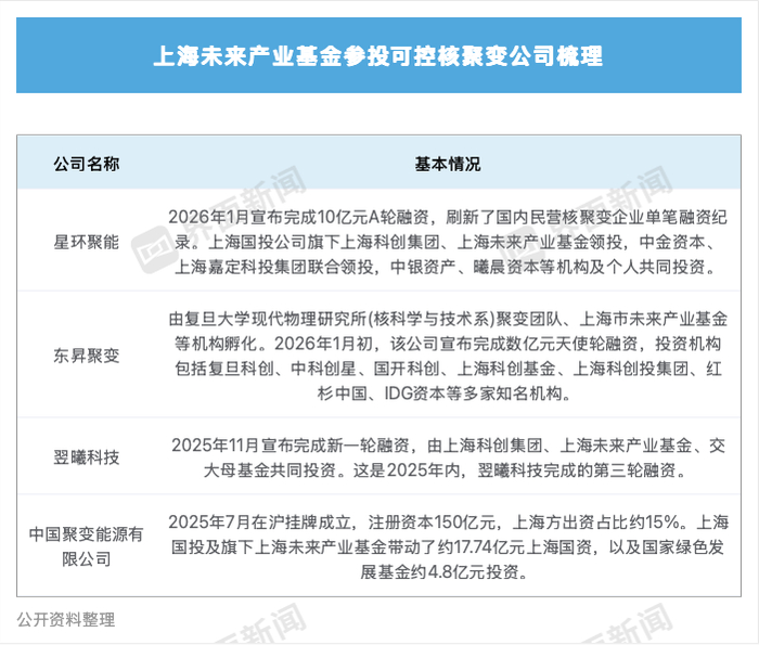上海正大力吸引核聚变产业链资源汇聚。 第一财经记者1月13日从星环聚能方面获悉,该公司近日完成10亿元A轮融资,资金用于推进下一代聚 变装置建设,助力公司在2028年前后完成工程验证、2032年左右建成可输出电能的聚变反应示范堆目 标。 此轮融资刷新了国内核聚变民营企业单笔融资纪录,由上海国资体系深度参与,上海国投公司旗下上海 科创集团、上海未来产业基金领投,中银资产、曦晨资本等十余机构及个人共同投资。星环聚能Pre-A 轮领投方上海科创集团旗下知识产权基金继续跟投。 2024年3月,《上海核电产业高质量发展行动方案(2024-2027年)》印发,提出开展磁-惯性约束聚变 能源系统研发,建成国际先进聚变能源中心,目标是到2027年形成600亿元核电产业规模。2025年10 月,上海市政府印发《关于加快推动前沿技术创新与未来产业培育的若干措施》,明确加速布局可控核 聚变等领域,重点支持技术难题攻关、技术路线收敛,开展产品研发或技术方案可行性验证。 政府资金亦给予配套支持。去年7月,中核集团直属二级单位中国聚变能源有限公司(下称"中聚变") 新增资115亿元在沪成立,注册资本达150亿元,上海国投旗下上海未来聚变 ...