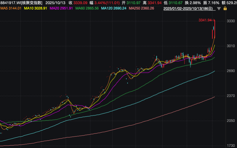 国庆期间,位于安徽合肥的紧凑型聚变能实验装置(BEST)项目建设取得关键突破以后,近期,资本市场对可控 核聚变领域的热情正以k线图的形式直观呈现。 目前,随着技术突破与政策红利的双重驱动,可控核聚变产业链已初步成型,形成"上游-原材料,中游-设备与工 程建设,下游-核电站运营"的产业链结构。有研究指出,核聚变能因其资源丰富、清洁绿色、安全高效等特点, 被视为未来理想终极能源的首要选择。 国际能源署预测,到2030年,全球核聚变市场规模有望达到4965.5亿美元,2024至2030年间复合年均增长率为 7.4%,市场潜力巨大。 技术突破引领板块强势突围 截至2025年10月13日,可控核聚变概念股龙头合锻智能实现4连板,报收26.16元/股。Wind数据显示,核聚变指数 (8841917.WI)逆势上涨3.44%,从10月9号至今,41家成分股中39家涨幅为正,年初至今已有11家企业股价实现 翻倍,指数累计涨幅为66.14%。 截至13日收盘,中洲特材(300963.SZ)以13.84%的涨幅领涨。公开资料显示,中洲特材凭借高温合金材料独家中 标BEST核聚变真空室支撑部件,订单额为1.8亿元。此外,中洲特材给 ...