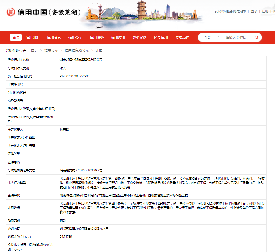 | 首页 | 信用組織 | 信用资讯 信用公示 | 信用服务 | 信用应用 | 典型案例 | 区县信用 | 专项治理 | まま | 418 | 请输入关键词 | Q | | --- | --- | --- | --- | --- | --- | --- | --- | --- | --- | --- | --- | | 您所在的位置:首页 > 信用公示 > 信用信息双公示 > 详情 | | | | | | | | | | | | | 行政相对人名称 | | 湖南湘西公路桥梁建设有限公司 | | | | | | | | | | | 行政相对人类别 | | 法人 | | | | | | | | | | | 统一社会信用代码 | | 914302007483755906 | | | | | | | | | | | 工商打册号 | | | | | | | | | | | | | 组织机构代码 | | | | | | | | | | | | | 税务登记号 | | | | | | | | | | | | | 行政相对人代码_5(事业单位证书号) | | | | | | | | | | | | | 行政相对人代码_6(社 ...