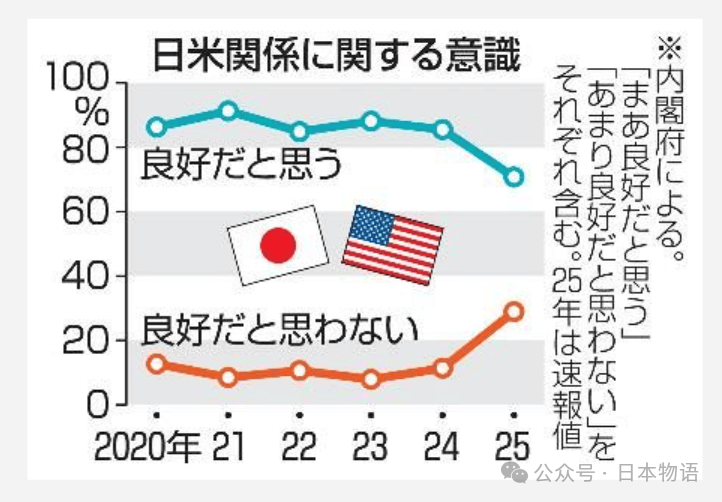 据日媒报道,11月28日日本内阁府公布了一组扎眼的数字。 认为日美关系"良好"的日本民众比例,跌至70.8%。这是自1998年开始类似调查以来,仅次于2008年 68.9%的第二低点。 跌幅更惊人。相比去年,这个数字暴跌了14.7个百分点。 对美国有"亲近感"的日本人,也从去年的84.9%降至77.0%。2025年6月的另一项调查更加直白:日本民 众对美国的信任度只剩22%,创下21世纪最低纪录。 与此同时,表示对中国"感觉亲近"或"感觉关系比较亲近"的受访者比例上升1.4个百分点,达到 16.1%…… 这些数字背后,是一个盟友关系正在经历的信任危机。而危机的导火索,指向一个名字:特朗普。 2025年4月,特朗普政府宣布对日本征收"对等关税"。汽车及零部件的关税税率设定为25%。7月,特朗 普致信日本首相石破茂,威胁从8月1日起将关税提高到100%。 这不是谈判筹码,而是赤裸裸的收保护费。日本汽车业是国脉,丰田、本田、日产等六大车企年扛2.6 万亿日元关税。 协议签了:关税降到15%,日本投5500亿美元。 2025年10月,一项民意调查显示,79.4%的日本人认为特朗普"对世界带来负面影响",仅有17.7% ...