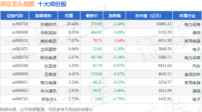| 证券代码 | 股票简称 | 权重 | 最新价 | 涨跌幅 | 总市值(亿元) | 所属行业 | | --- | --- | --- | --- | --- | --- | --- | | sz300750 | 宁德时代 | 20.44% | 370.00 | -2.48% | 16885.22 | 电力设备 | | sz300308 | 中际旭创 | 8.35% | 464.01 | -5.69% | 5155.70 | ● 通信 | | sz000333 | 美的集团 | 7.67% | 78.75 | 1.04% | 661509 | 家用电器 | | sz002475 | 立讯精密 | 6.06% | 52.85 | -5.20% | 3848.59 | ▼ 电子 | | sz300274 | 阳光电源 | 5.67% | 167.89 | -5.34% | 3480.71 | 电力设备 | | sz002594 | 比亚迪 | 5.25% | 92.70 | -0.97% | 8451.64 | 汽车 | | sz000858 | 五根液 | 4.41% | 119.68 | -0.47% | 4 ...