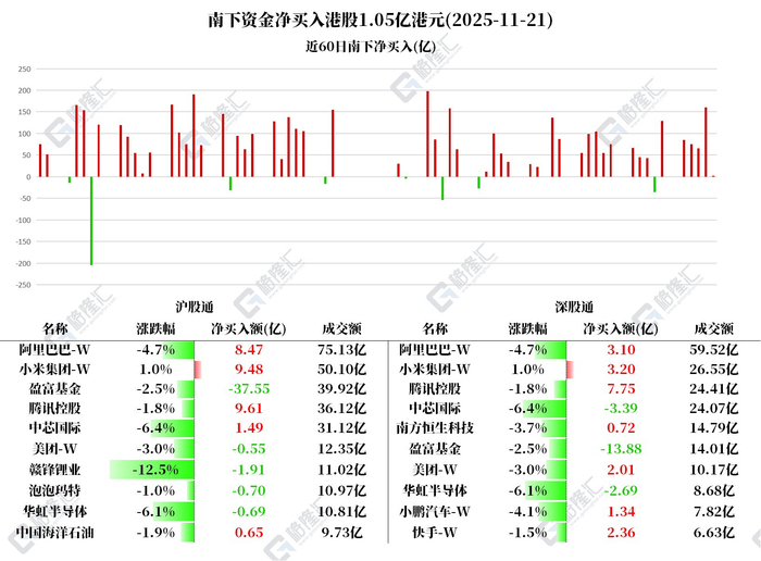 最新出炉!11月21日港股通净流入1.05亿港元,其中17.361亿港元都买了它