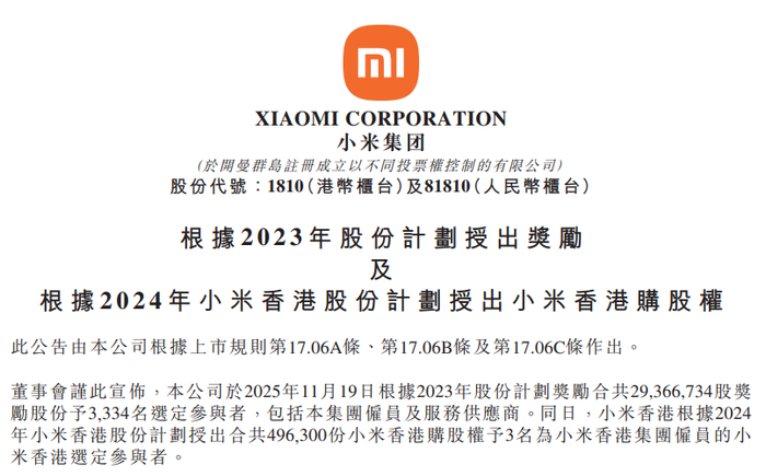 记者丨雷晨 编辑丨张伟贤 小米集团-W(01810.HK)于11月19日晚间发布公告,宣布根据2023年股份计划向3334名选定参与者奖 励合共2936.67万股奖励股份,约占公司已发行股本的0.11%。若以小米11月19日收盘价每股38.82港元 测算,本次授予股份的总价值约11.4亿港元。 与此同时,小米还根据2024年股份计划,向3名小米香港集团雇员授出合共49.63万份小米香港购股权。 股份奖励方面,覆盖范围不仅包括集团员工,还涉及供应商,人均获授股份价值约34.2万港元。奖励股 票于2025年11月20日至2034年11月20日期间归属。 根据公告,小米股权激励池尚有5.77亿股可供未来授出,其中计划授权限额和服务供应商分项限额,分 别有5.27亿股及0.5亿股。 购股权部分,3名雇员人均购股权数量达16.54万份,该计划将于2026年11月20日至2030年8月20日期间 归属。 当前,股权激励已成为科技企业吸引和保留人才的标配工具。小米正推进智能汽车、AIoT等需长期投 入的硬核科技领域,这类业务既需要稳定的内部人才团队,也离不开供应链的紧密配合。股份激励无疑 将激发基层员工与合作伙伴的长期积极 ...