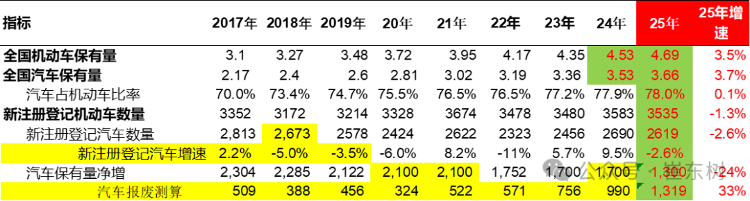 | 指标 | | | | 2017年 2018年 2019年 20年 21年 22年 23年 24年 | | 25年 | 25年撮 速 | | --- | --- | --- | --- | --- | --- | --- | --- | | 全国机动车保有量 | 3.1 | 3.27 | 3.48 3.72 | 3.95 | 4.17 4.35 4.53 4.69 | | 3.5% | | 全国汽车保有量 | 2.17 | 2.4 | 2.6 2.81 | 3.02 | 3.19 3.36 3.53 3.66 | | 3.7% | | 汽车占机动车比率 | 70.0% | 73.4% | 74.7% 75.5% | | 76.5% 76.5% 77.2% 77.9% 78.0% | | 0.1% | | 新注册登记机动车数量 | 3352 | 3172 | 3214 3328 | 3674 | 3478 3480 3583 3535 | | -1.3% | | 新注册登记汽车数量 | 2.813 | 2.673 | 2578 2424 | 2622 | 2323 2456 2690 2619 | | -2. ...