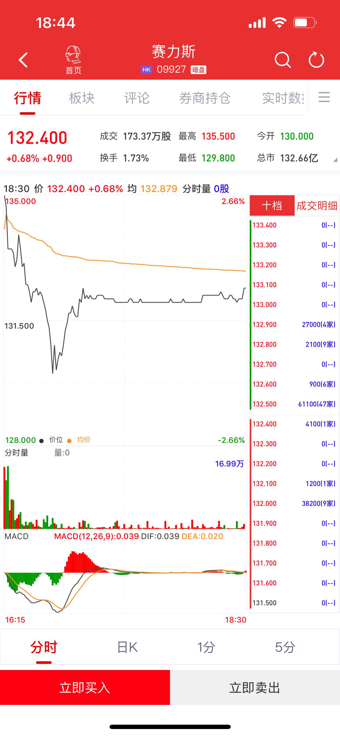 | 18:44 | | | | .II ? ■ ! | | --- | --- | --- | --- | --- | | | | 赛力斯 | | O | | 首页 | | нк 09927 暗盘 | | | | 行情 | 板块 | 评论 | 券商持仓 | 实时数: | | 132.400 | | 成交 173.37万股 最高 135.500 | | 今开 130.000 | | +0.68% +0.900 | | 换手 1.73% | 最低 129.800 | 总市 132.66亿 | 分时量 量:0 16.99万 132.200 132.100 120( 132.000 3820( 131.900 MACD MACD(12,26,9):0.039 DIF:0.039 DEA:0.020 131.800 131.700 131.600 131.500 16:15 18:30 分时 5分 1分 日K 立即买入 立即卖出 • 行情来源: 利弗莫尔证券 • 赛力斯(601127)(09927)将于11月5日(周三)在香港挂牌。截至收盘,利弗莫尔证券暗盘交易显示报价132.4港元,较招股价131.50港元上涨0.6 ...