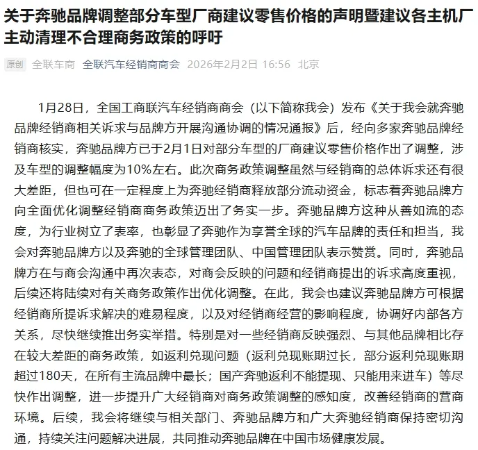2026年的中国豪华车市,开年便充满了戏剧性。当"反内卷"的呼声仍在车市上空回荡, 奔驰——这位一直以来"反内卷"的坚定倡导者,却在全国工商联汽车经销商商会三封函件的 推动下,跟上了宝马降价的步伐,在"反内卷"的坚守与"降价10%"的现实之间,陷入两难境 地。 然而,市场的现实压力却让奔驰的"反内卷"之路步履维艰。2025年,奔驰在中国市场的 表现不尽如人意,销量同比下跌19%至57.5万辆。销量下滑的背后,是经销商群体日益加剧 的经营困境。经销商商会于2025年末收到部分奔驰经销商反映,他们在经营中普遍面临库存 过高、价格倒挂严重、返利兑现周期过长、商务考核压力过大以及没有退网补偿机制等一系列 问题。 面对经销商的困境,经销商商会于2025年12月9日向北京梅赛德斯-奔驰销售服务有限公 司发函沟通,又在2026年1月6日、1月23日两次向梅赛德斯-奔驰全球管理团队致函,呼吁 其"高度关注中国市场渠道风险",并从总部层面推动结构性改善。 在经销商商会的三次致函下,奔驰最终做出了妥协。2026年2月1日,奔驰对旗下C级、 GLC以GLB三款主力车型的厂商建议零售价下调10%,部分车型降价幅度甚至突破6万元。 对 ...