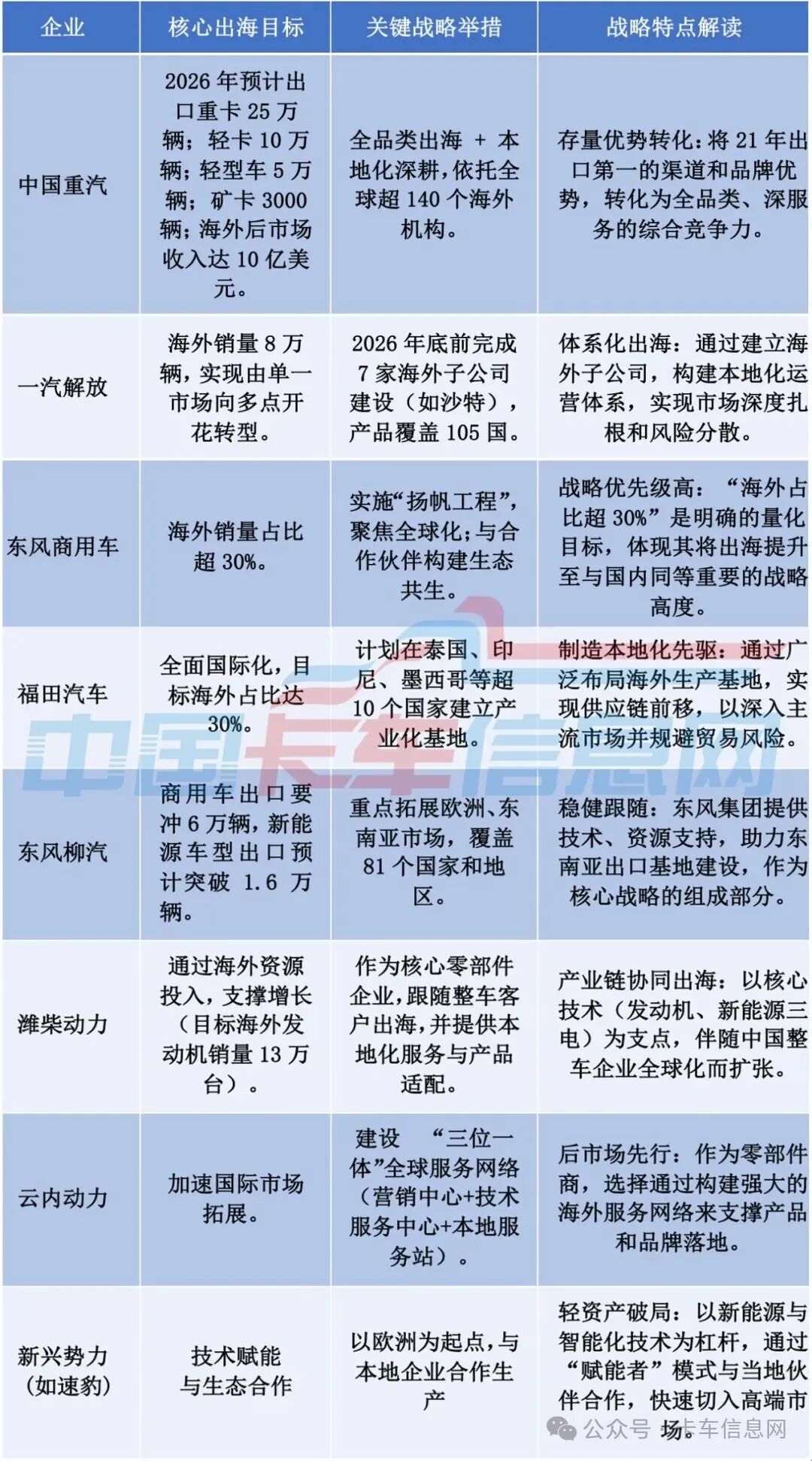 回顾历程,中国卡车出海大致走过了三个阶段: 1.0 产品输出时代(过去):以性价比为武器,通过贸易形式将整车卖向发展中国家,核心是"买卖关系"。 2026年,"出海"。已然演变为决定企业排位赛的"主战场"。通过对主流车企战略的梳理,我们清晰地看到,一场从"产品贸易"到"生态布局"、从"中国制 造"到"全球运营"的深度嬗变正在发生。 中国卡车的出海,正式迈入了以"全价值链本地化"为核心的 3.0时代。 一、从"出海1.0"到"出海3.0"的路径演进 2.0 市场深耕时代(进行中):在重点市场建立经销网络,提供售后配件,开始关注品牌认知,但核心资产与决策仍高度集中在国内。 3.0 链式扎根时代(2026关键节点):这正是我们在2026年各车企战略中看到的共同指向——将研发、制造、供应链、金融、服务等全价值链环节,有选 择地植入目标市场,与当地经济深度绑定,实现"在地化生存与发展"。 二、2026多元战略路径并存 各企业出海战略一览 | 企业 | 核心出海目标 | 关键战略举措 | 战略特点解读 | | --- | --- | --- | --- | | 中国重汽 | 2026 年预计出 | | | | | 口重卡 ...