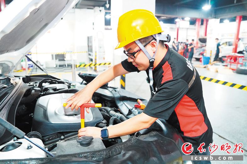 长沙晚报全媒体记者 匡小娟 国庆中秋假期,高速公路上车流滚滚,在这片流动的风景中,绿色牌照的新能源车已占据相当比例。然而,当 大多数车主惬意地出门旅游、回家团圆时,有一群人却进入了最为紧张的忙碌时刻。 这个假期,位于雨花区的途虎养车工场店(长沙杉木冲东路店),技术主管周铁和他的团队几乎要在车轮边和 举升机下度过。 现场:绝缘布上的"数据诊疗" 10月4日,记者在店里见到周铁时,他正"全副武装":头戴安全帽,脚穿绝缘鞋,专注地盯着一台连接着一辆绿 牌混动汽车的诊断电脑屏幕。屏幕上跳跃的数据,指向了问题的核心——电池存在故障。 "车主反映这辆车油耗过高。"周铁向记者解释,"对混动车而言,油耗异常,往往意味着电池系统无法高效工 作,导致发动机被迫更多地介入。" 他所在的新能源工位,与传统燃油车的维修区不同:地面铺着厚厚的绝缘布,四周设有醒目的防护围栏和"高压 危险"警示牌,旁边专门配备了电池专用的灭火器和绝缘救援钩。 "新能源车的电池电压远高于我们日常接触的电器,普遍在400伏到800伏之间。所以,只要维修新能源车,就必 须佩戴齐安全帽、绝缘鞋、手套和防护眼镜这'四大件'。"周铁表示,这是检修新能源车的"标准配置" ...