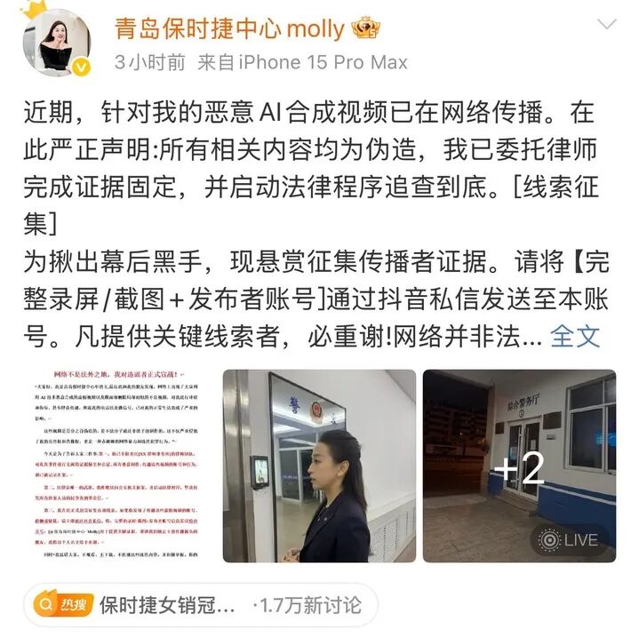 (来源:荔枝锐评) 转自:荔枝锐评 34岁的青岛保时捷销售冠军牟女士,凭借两年售出340辆、月度蝉联销冠的亮眼业绩登上热搜。这份奋 斗本该赢得掌声,却意外坠入一场恶意编织的网络漩涡——聊天骚扰接踵而至,AI合成的虚假不良视 频在网络空间肆意传播,个人手机号、微信号等隐私信息被公然泄露。这起AI滥用事件,既严重侵害 个体权益,更折射出技术失范对社会秩序的潜在威胁。 牟女士以专业素养与不懈努力成为行业标杆,竟不料成为别有用心者的目标。对当事人而言,那些无中 生有的虚假视频,带来的不仅是陌生人的指责与揣测、工作生活失控的困境,还有精神层面难以愈合的 创伤。 细究这场闹剧背后,网友分析可能有嫉妒者因眼红业绩,借AI造谣中伤以泄私愤,也可能有逐利者觊 觎流量热度,将他人痛苦当作博取关注的"筹码",无视信息真伪疯狂传播。而网络空间的匿名性与传播 的便捷性,进一步放大了这种恶意。部分网友随手转发虚假视频,觉得"只是看个热闹"无关紧要;还有 人抱持从众心理,盲目跟风声讨。殊不知,每一次随意转发、每一句无端指责都是对受害者的二次伤 害。 AI本应是服务人类、推动社会进步的工具,却成了制造谣言、攻击他人的"武器"。这种错位不仅让 ...