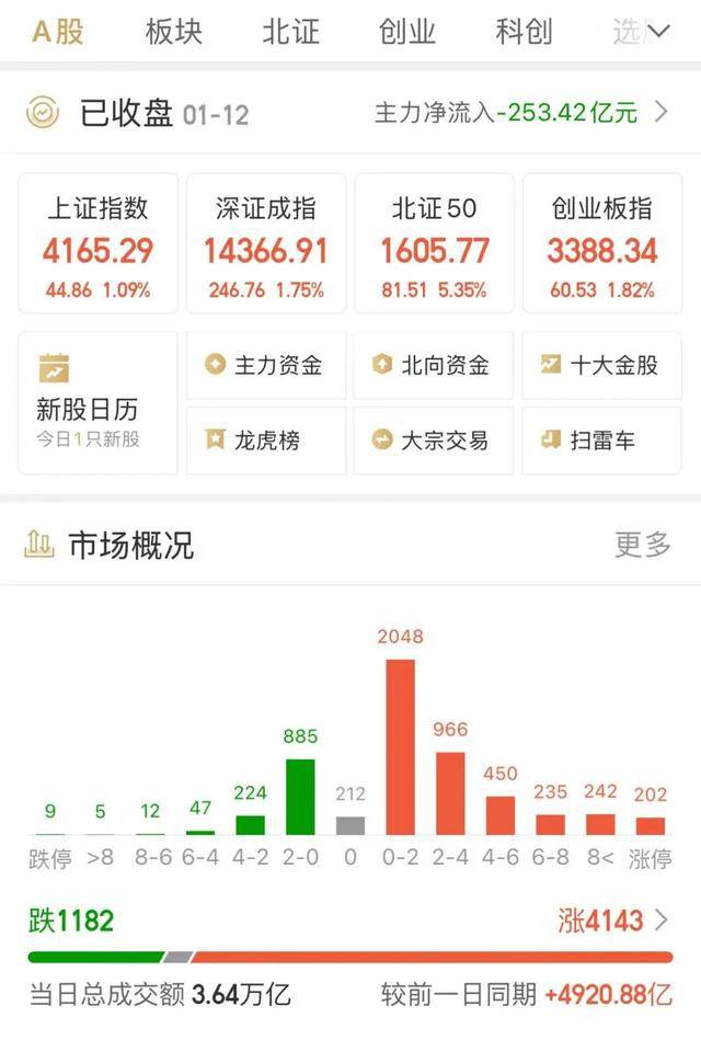 据Wind统计,A股成交额突破3万亿元此前总共发生了6次,分别是2024年10月8日,2025年8月25日、8 月27日、8月28日和9月18日,2026年1月9日。 截至1月12日下午收盘,沪指涨超1%,录得"17连阳",深证成指涨1.75%,创业板指涨1.82%。全市成交 额3.64万亿元,刷新此前在2024年10月8日创下的34549.33亿元的成交额历史纪录,再创新高;超4100只 个股上涨。 板块方面,商业航天、AI应用两大方向领涨市场,脑机接口概念走高,电商、短剧游戏等板块领涨; 算力硬件、保险、油气等方向跌幅居前。 "当前,A股的火热历史罕见,连回调都没有!"一位广州的老股民李先生惊呼,1月12日上午开盘仅一 个小时,两市成交量接近1.7万亿,半日成交额破2.31万亿元,资金跑步进场,热点全面开花。截至上午 收盘,沪指报4151.14,涨0.75%;深成指涨1.31%,创业板指走出"V"字反弹,涨1.17%。 中航证券首席经济学家董忠云认为,从2026年第一周来观察,春季躁动或已迎来主升浪,行情主要来自 基本面、政策面和基本面改善的支撑。他指出,2025年12月国内通胀数据持续改善,其中,CPI ...