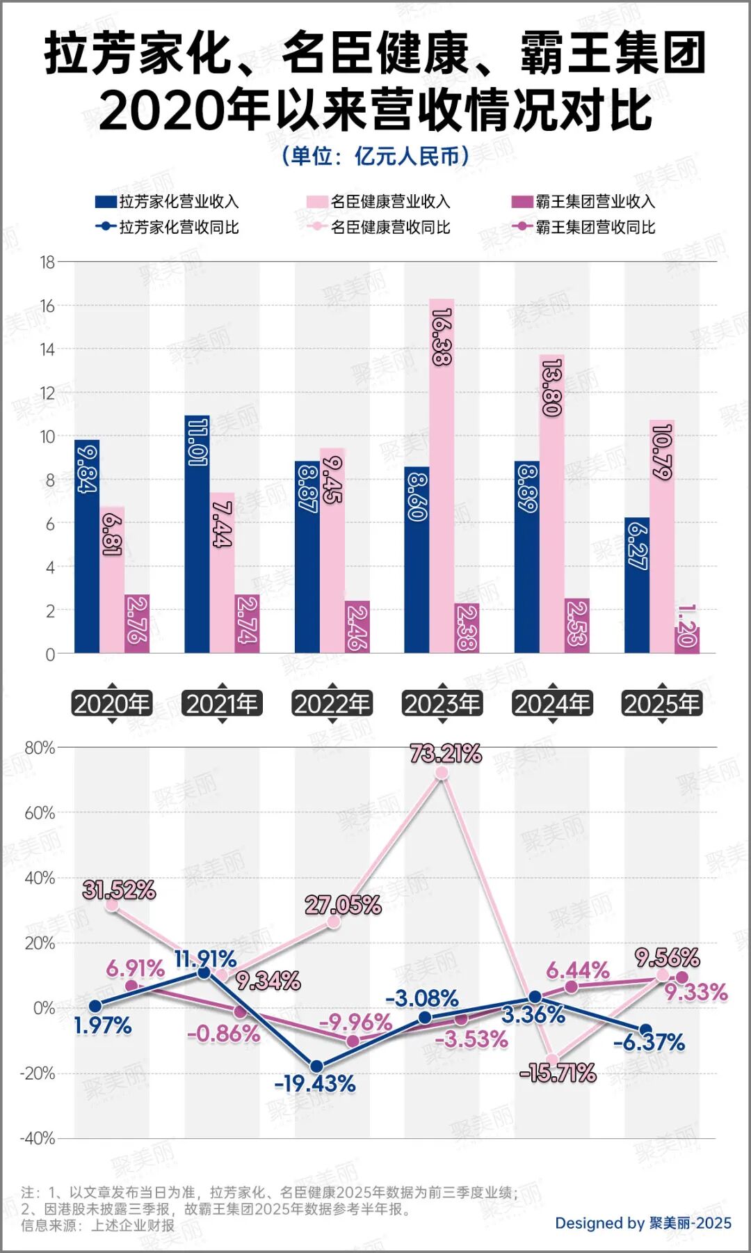 "爱生活,爱拉芳。" "蒂花之秀,青春好朋友" "霸王洗发水,洗出英雄本色。" 曾经刷爆各大卫视耳熟能详的广告语,一度成为大家的回忆杀。然而近几年,这些老牌洗护却渐渐从年轻一代消费者的购物车里消失了。 除此之外,其业绩表现也堪忧。其中,聚美丽发现,老牌洗护企业拉芳家化股份有限公司(以下简称"拉芳家化"),业绩暴跌,净利润高位数下滑。 无独有偶,蒂花之秀母公司名臣健康用品股份有限公司(以下简称"名臣健康"),归母净利与扣非净利润的下滑程度达90%。 此外,港股上市的霸王国际(集团)控股有限公司(以下简称"霸王集团"),已在亏损边缘徘徊。 那么,拉芳家化、名臣健康在2017年相继作为第一、第二家上市的日化洗护类企业,为何如今业绩却"一蹶不振"?而霸王集团为何已"入不敷出"? 本文,聚美丽将结合拉芳家化、名臣健康、霸王集团三家老牌洗护企业近几年的业绩情况,窥其下滑原因,洗护赛道是否真的不香了? 近千亿洗护市场,老国货困于10亿级体量? 从近几年的发展来看,洗护赛道的前景还是比较乐观的。据网络数据显示,2024年洗护品类市场规模为899.95亿元,同比增长59.32%,是增幅最快的品 类。 但从这三家近5年的业绩情况 ...