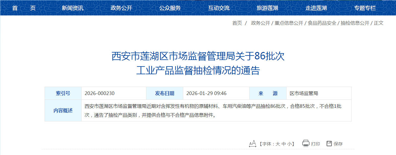 西安市莲湖区市场监督管理局发布86批次工业产品监督抽检情况