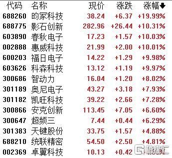 港股市场同样表现强劲,消费电子产品板块涨幅居前。截至发稿,TCL电子、思摩尔国际双双涨超 6%,创维集团跟涨。 | 代码 名称 | 现价 涨跌 涨幅� | | --- | --- | | 688260 的冢科技 | 38.24 +6.37 +19.99% | | 688775 影石创新 | 282.96 +26.44 +10.31% | | 603890 春秋电子 | 17.23 +1.57 +10.03% | | 002888 惠威科技 | 21.99 +2.00 +10.01% | | 600203 福日电子 | 14.22 +1.29 +9.98% | | 603626 科森科技 | 13.12 +1.19 +9.97% | | 300686 智动力 | 16.04 +1.20 +8.02% | | 301189 奥尼电子 | 43.27 +3.18 +7.93% | | 301182 凯旺科技 | 39.22 +2.66 +7.28% | | 300866 安克创新 | 113.45 +7.05 +6.60% | | 300647 超频三 | 7.44 +0.44 +6.29% | | 301383 ...