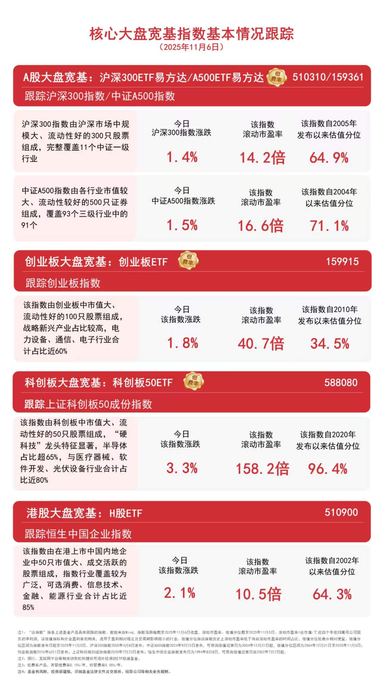 | 科技"龙头特征显者,半导体 | | --- | | 占比超65%,与医疗器械、软 | | 件开发、光伏设备行业合计占 | | 比近80% | A股三大指数集体高开高走,上证指数大涨近1%再次收复4000点,全市场成交额20759亿元,较上日放量1816亿元。板块题材上,磷化工、金属铝、存 储芯片、农药、CPO、电源设备板块涨幅居前,海南自贸区、冰雪产业、短剧游戏、零售、港口航运板块跌幅居前。港股板块全线反弹,大型科技股领涨, 医药股尾盘回暖。截至收盘,中证A500指数上涨1.5%,沪深300指数上涨1.4%,创业板指数上涨1.8%,上证科创板50成份指数上涨3.3%,恒生中国企业指 数上涨2.1%。 | 沪深300指数由沪深市场中规 | マ日 | 该指数 | 该指数 | | --- | --- | --- | --- | | 模大、流动性好的300只股票 | 沪深300指数涨跌 | 滚动市盈率 | 发布以来 | | 组成,完整覆盖11个中证一级 行业 | 1.4% | 14. 2倍 | 64 | | 中证A500指数由各行业市值较 | マ日 | 该指数 | 该指数 | | 大、流动性较好的500只证券 | ...