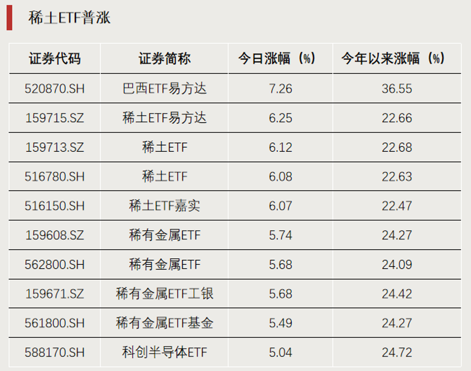 01 2月25日,A股主要指数集体收涨,创业板指涨超1.4%。全市场1400余只ETF中,超过1000只上涨。 02 稀土和稀有金属板块ETF涨势亮眼。8只相关ETF跻身单日涨幅榜前十,涨幅全部超过5%。今年以来,这8只ETF累计涨幅均已超过 20%。 03 前一交易日(2月24日),ETF全市场单日获资金净流入额超过110亿元。这也是近6个交易日以来,单日资金净流入额最高的一天。 主投港股市场的ETF吸金势头较强。单日资金净流入额前十的ETF中,港股ETF占比过半。 稀土和稀有金属ETF普涨 2月25日,主投稀土和稀有金属板块的8只ETF全部收涨,涨幅居ETF市场前列。其中,4只产品挂钩中证稀土产业指数,均涨超 6%;4只产品挂钩中证稀有金属主题指数,均涨超5%。 | 证券代码 | 证券简称 | 今日涨幅 (%) | 今年以来涨幅 (%) | | --- | --- | --- | --- | | 159518.SZ | 标普油气ETF嘉实 | -2.72 | 19.93 | | 513350'SH | 标普油气ETF | -1.81 | 21.77 | | 562030.SH | 信创ETF基金 | -1 ...