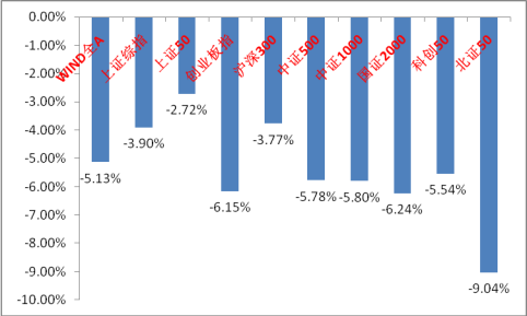市场上周宽幅震荡,资金面层面,市场量能偏低,多种技术指标偏弱。 周五的市场加速下跌早有端倪,进入11月后市场持续平淡,宏观层面短期利空因素更多,如地缘政治风 险、美国降息预期降低、美国国内对AI巨头盈利能力担忧加剧、国内基本面持续弱势等。资金面层 面,随着市场调整居民端增量资金继续观望,而年底接近和公募基金考核标准的导向变化也使得公募行 为更加保守。在此背景下美股科技股下跌更易带动国内相关标的调整。避险类红利和一些顺周期行业短 期表现较好,短期市场大背景仍将是震荡,应降低一些收益预期,红利避险类短期可能继续占优。中期 市场回顾 上周A股主要指数均下跌,调整中量能降低。 31个申万一级行业中银行、传媒和食品饮料相对表现较好。 A股主要指数周涨跌幅(%) 资料来源:wind;统计区间:2025/11/17-2025/11/21 申万一级行业周涨跌幅(%) 资料来源:wind;统计区间:2025/11/17-2025/11/21 宏观数据分析 美国9月新增非农就业为11.9万人,超预期(预期5.1万),但8月数据从2.2万下修至-0.4万;失业率 4.4%,略高于预期和前值(4.3%)。此为美国政府走出停摆后的第一 ...