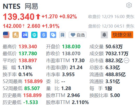 | NTES 网易 | | | | --- | --- | --- | | 139.340 ↑ +1.270 +0.92% | | 收盘价 12/29 16:00 美东 | | 142.000 ↑ 2.660 +1.91% | | 盘前价 12/30 04:51 美东 | | 一 7 24 4 8 8 8 日 0 | | ● 快捷交易 | | 最高价 139.340 | 开盘价 138.030 | 成交量 50.63万 | | 最低价 137.780 | 昨收价 138.070 | 成交额 7032.17万 | | 平均价 138.897 | 市盈率 17.30 | 总市值 882.3亿 (…) | | 振 幅 1.13% | 市盈率(静) 21.24 | 总股本 6.33亿 | | 换手率 0.14% | 市净率 3.955 | 流通值 488.85亿 | | 52周最高 158.899 委 比 -- | | 流通股 3.51亿 | | 52周最低 85.507 | 量 比 1.28 | 色 手 1股 | | 历史最高 158.899 股息TTM 2.946 | | 换股比率 5.00 | | 历史最低 - ...