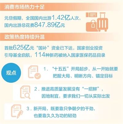 "2026年是'十五五'开局之年。锐始者必图其终,成功者先计于始。" 进入2026年,中国经济在人们的忙碌劲和升腾的烟火气中争创"开门红"。 供需结构优化,政策红利释放,消费市场热力十足。冰雪游、演艺观赏、商圈购物等业态呈现蓬勃增长 态势。元旦假期,全国国内出游1.42亿人次,国内出游总花费847.89亿元。封关红利与假期效应叠加, 元旦当天海南离岛免税销售额同比增长93.8%。 抢抓时间窗口,主动靠前发力,政策热度持续升温。"两新"打头阵,首批625亿元"国补"资金已下 达;"两重"接续发力,国家发展改革委组织下达2026年提前批"两重"建设项目清单和中央预算内投资计 划;国家创业投资引导基金启航,"购在中国"暨新春消费季启动,114种新药被纳入国家医保药品目 录……以更大力度促消费、稳投资、惠民生,全力实现一季度良好开局,为"不断巩固拓展经济稳中向 好势头"夯基垒台。 "省委书记加我微信了!"最近,丹东东方测控集团董事长包良清常与周围人说起,"现在,辽宁干部真 把企业的事当作自家事来办!" 新年伊始,各省区市"一把手"都很忙。根据公开报道统计,2026年开年仅一周多时间,31个省区市的党 委书记们通过会议 ...