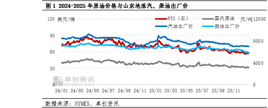 Core Viewpoint - The oil market is experiencing a weak trend due to oversupply and seasonal demand decline, leading to a divergence in gasoline and diesel prices and refining profits [1][4][6]. Group 1: International Oil Price Analysis - In December, WTI crude oil average price decreased by 2.71% and Brent by 3.19%, maintaining a weak trend due to oversupply and geopolitical risks [1]. - The outlook for January 2026 suggests further decline in oil prices, driven by a loose fundamental environment and geopolitical factors [1]. Group 2: Domestic Oil Price Transmission - The fluctuation in crude oil prices directly impacts domestic refining sectors, affecting product prices and profit margins [2][4]. - In December, gasoline prices in Shandong experienced a slight increase of 0.34% despite a cumulative drop of 70 CNY/ton, while diesel prices fell by 4.86% with a cumulative drop of 515 CNY/ton [4][6]. Group 3: Gasoline and Diesel Price Trends - Gasoline market prices showed a narrow fluctuation, while diesel prices experienced a downward trend due to seasonal demand decline [4][6]. - The average gasoline crack spread in Shandong rose by 18.82% to 852.69 CNY/ton, while the diesel crack spread fell by 17.95% to 709.74 CNY/ton [4][6]. Group 4: Wholesale and Retail Price Analysis - The average theoretical wholesale-retail price spread for gasoline decreased by 6.8% to 1933.13 CNY/ton, while diesel's increased by 16.91% to 1404.17 CNY/ton [8][10]. - Actual retail price spreads for gasoline and diesel were reported at 1268 CNY/ton and 998.8 CNY/ton respectively, with minor fluctuations in theoretical profits [8][10]. Group 5: Future Outlook - The forecast for January indicates a continuation of the divergence in refining profits and price spreads for gasoline and diesel, with gasoline prices expected to slightly rise and diesel prices to decline [9][11].