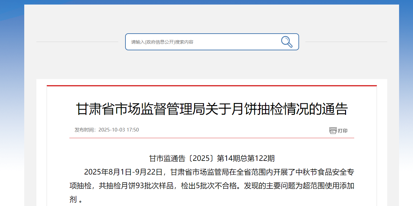 甘肃省市场监督管理局关于月饼抽检情况的通告
