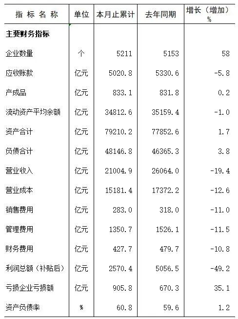 | 指 标 名 称 | 单位 | 本月止累计 | 去年同期 | 增长(增加) | | --- | --- | --- | --- | --- | | | | | | 8 | | 主要财务指标 | | | | | | 企业数量 | 个 | 5211 | 5153 | 58 | | 应收账款 | 亿元 | 5020. 8 | 5330. 6 | -5.8 | | 产成品 | 亿元 | 833. 1 | 831. 8 | 0.2 | | 流动资产平均余额 | 亿元 | 34812. 6 | 35159. 4 | -1.0 | | 资产合计 | 亿元 | 79210. 2 | 77852. 6 | 1.7 | | 负债合计 | 亿元 | 48146. 8 | 46365. 3 | 3.8 | | 营业收入 | 亿元 | 21004. 9 | 26064. 0 | -19.4 | | 营业成本 | 亿元 | 15181. 4 | 17372. 2 | -12.6 | | 销售费用 | 亿元 | 283.0 | 318. 0 | -11.0 | | 管理费用 | 亿元 | 1350. 7 | 1526. 1 | -11. ...