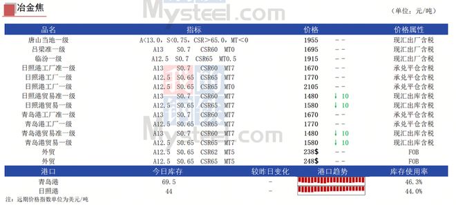 1、全国30家独立焦化厂吨焦盈利情况,全国平均吨焦盈利19元/吨;山西准一级焦平均盈利20元/吨, 山东准一级焦平均盈利80元/吨,内蒙二级焦平均盈利-19元/吨,河北准一级焦平均盈利77元/吨。(利 润展示受小数点后保留精度影响,本次价格的统计周期为2025年11月14日-2025年11月20日) 2、全国247家钢厂样本:焦炭日均产量 46.22 增 0.05,产能利用率85.23% 增 0.09 %;焦炭库存 622.34 减 0.06,焦炭可用天数 11.05天 减 0.01天;炼焦煤库存 797.08 增 6.91,焦煤可用天数12.97天 增 0.10 天;喷吹煤库存 427.45 增 2.20,喷吹可用天数 12.51天 增 0.06 天。 3、近期炼焦煤现货供需逻辑转弱,全国平均吨焦盈利19元/吨,环比增加53元/吨,创逾两个月高位。 但整体开工一般,暂无明显复产迹象,而下游阶段性补库之后,采购较为谨慎。本周独立焦企焦炭库存 增加12.3%至65.29万吨,钢厂焦炭库存微降至622.34万吨,同比仍增近5%,港口库存继续回落,但同比 增幅达23.75%,焦炭综合库存增加0.98万吨至941.0 ...