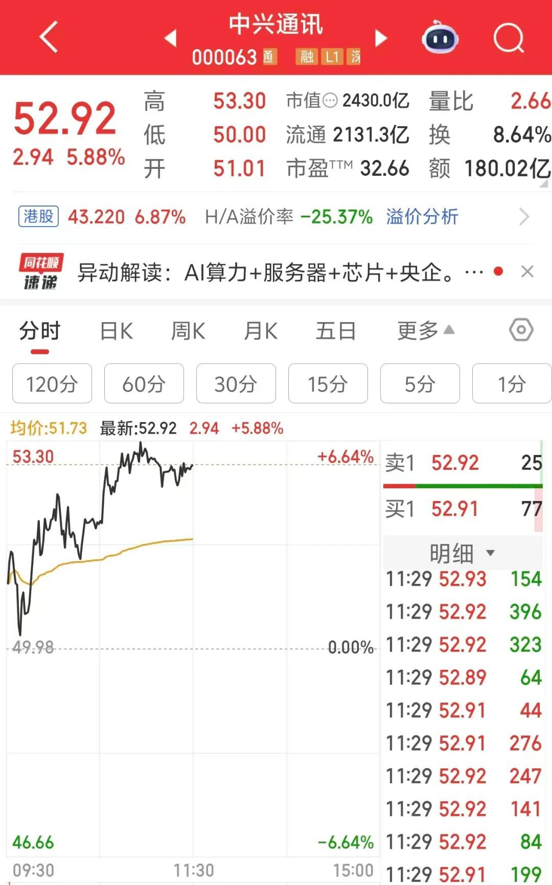 今天上午,近期的三大人气板块——科技、有色金属、新能源,集体调整。 中兴通讯9月26日在互动易平台表示,2025年上半年,公司服务器及存储收入同比增长超200%,其中AI服务器收入占比55%。公司将继续加深与互联网和 金融行业头部客户的战略合作,推动通用计算、智能计算及信创服务器等产品的规模化应用,并深化电力、交通等重点行业的业务布局,进一步提升算力 产品的市场份额。 上午收盘,上证指数下跌0.51%,深证成指下跌1.85%,创业板指下跌3.4%。市场半日成交额超1.65万亿元。 科技股方面,半导体产业链跌幅居前,中芯国际下跌7.35%,华虹公司、海光信息、芯原股份等龙头股大跌。 中芯国际昨天上午盘中创下历史新高,下午股价持续下跌,"多家券商将中芯国际折算率调整为0"的消息被市场视为下跌诱因。 比亚迪也曾发生过类似情形。2022年6月13日,比亚迪上午冲高,股价创当时的历史新高,午后持续下跌,当天市场传出"有券商将比亚迪的保证金折算率 由60%调低至0"的消息。比亚迪在随后的一段时间,呈现高位区间震荡态势。 通信设备龙头中兴通讯,昨天涨超9%,今天上午大涨5.88%,成交额为180亿元,居A股第一,盘中最高涨 ...