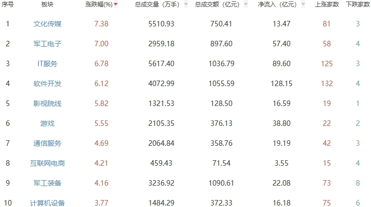 (责任编辑:马欣) | 序号 | 板块 | 涨跌幅(%)▼ | | 总成交量(万手) = 总成交额(亿元) ▼ | 净流入 (亿元) ▼ | 上涨家数 | 下跌家数 | | --- | --- | --- | --- | --- | --- | --- | --- | | 1 | 文化传媒 | 7.96 | 7244.83 | 947.88 | 4.59 | 82 | 2 | | 2 | IT服务 | 7.92 | 8224.94 | 1538.89 | 122.25 | 125 | 3 | | 3 | 软件开发 | 7.76 | 6402.23 | 1713.92 | 214.60 | 133 | র্ব | | র্ব | 军工电子 | 7.34 | 4143.92 | 1315.90 | 58.34 | 28 | ব | | 5 | 影视院线 | 6.48 | 1975.38 | 192.99 | 20.39 | 19 | 1 | | 6 | 游戏 | 5.98 | 2981.43 | 508.09 | 43.01 | 21 | 3 | | 7 | 互联网电商 | 5.59 | 713.45 | 106 ...