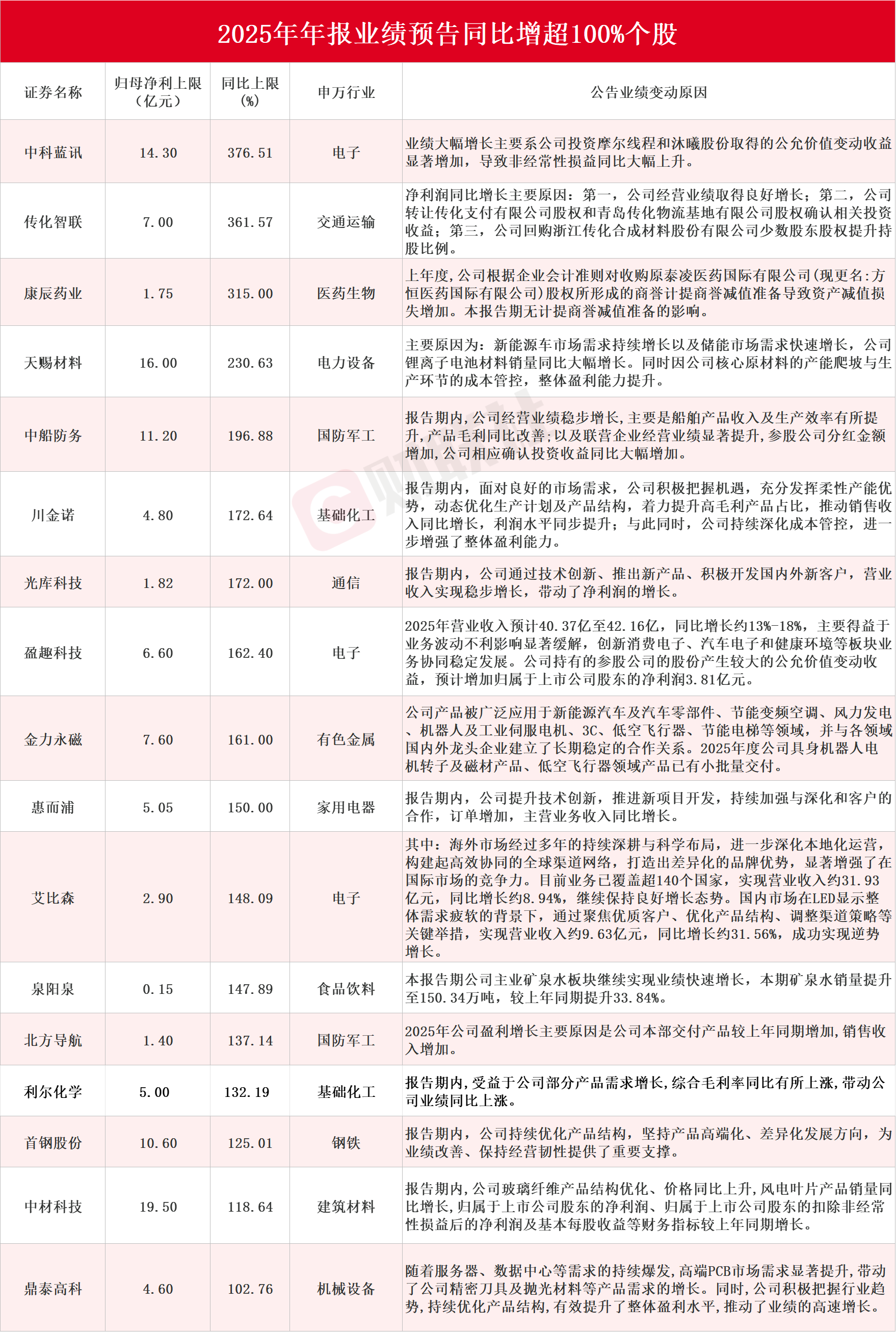 我国血凝酶制剂龙头企业康辰药业业绩增速暂居第三,康辰药业1月7日发布2025年度业绩预告,预计归属于母公司所有者的净利润为1.45亿元-1.75亿元,与 上年同期相比增加243%到315%。上年度,公司根据企业会计准则对收购原泰凌医药国际有限公司(现更名:方恒医药国际有限公司)股权所形成的商誉计提商 誉减值准备导致资产减值损失增加。本报告期无计提商誉减值准备的影响。 | 证券名称 | 归母浄利上限 | 同比上限 | 申万行业 | | | --- | --- | --- | --- | --- | | | (亿元) | (%) | | | | 中科蓝讯 | 14. 30 | 376.51 | 电子 | 业绩大幅增长主要系公司 显著增加,导致非经常忆 | | | | | | 净利润同比增长主要原E 转让传化支付有限公司] | | 传化智联 | 7.00 | 361. 57 | 交通运输 | | | | | | | 收益;第三,公司回购湘 股比例。 | | | | | | 上年度,公司根据企业会 | | 康辰药业 | 1.75 | 315.00 | 庆药生物 | 恒医药国际有限公司)股 | | | | | | 失增 ...