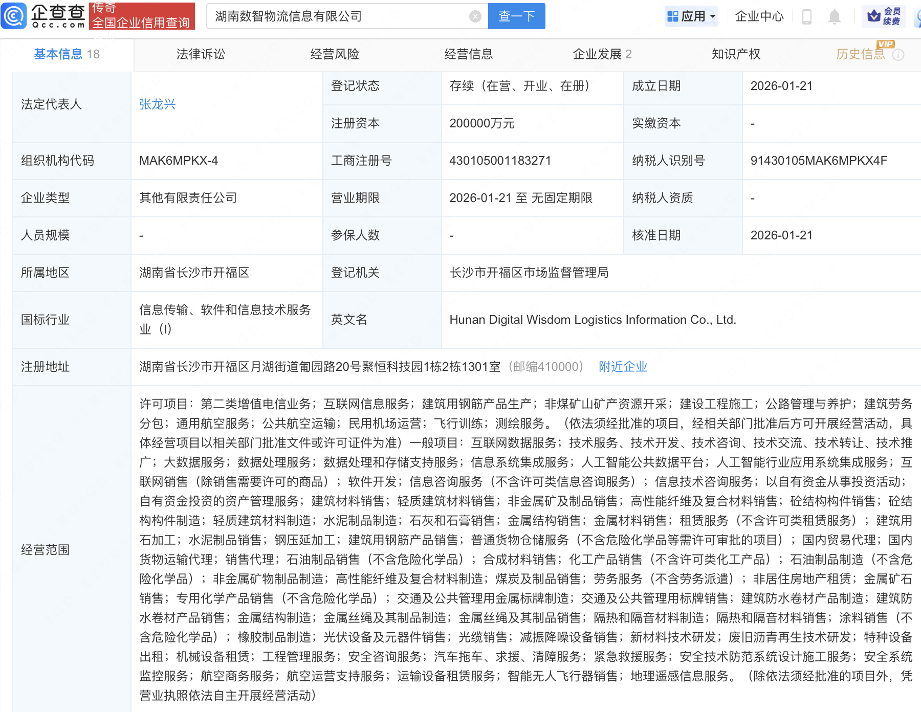 湖南数智物流信息公司登记成立,注册资本20亿