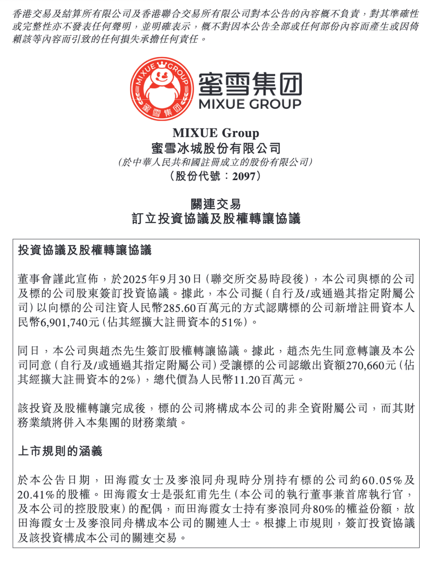就在一天前,蜜雪集团(HK.2097)于香港联交所发布公告称,其已在9月30日盘后与福鹿家(郑州)企业 管理有限公司(简称"福鹿家")达成投资及股权转让协议——以约2.97亿元人民币的价格获得鲜啤福鹿 家53%的股权。 完成投资后,蜜雪集团的产品品类将从现制果饮、茶饮、冰淇淋和咖啡延伸至现打鲜啤,本次交易也被 视为蜜雪冰城正式切入现打啤酒赛道,补齐了其多样化产品生态的关键拼图。 10月2日,"蜜雪冰城要卖啤酒了"话题冲上热搜,"雪王"跨界卖啤酒或将改变现制鲜啤行业格局引发关 注。 双方实控人为夫妻 根据上述公告,此次交易分为两个部分。一是增资入股,蜜雪集团首先以2.856亿元现金,认购福鹿家 新增注册资本690.17万元,占其经扩大注册资本的51%。二是与鲜啤福鹿家原股东赵杰签订协议,以 1120万元受让其持有的2%股权。交易完成后,蜜雪集团将合计持有福鹿家53%的股权,一举成为控股 股东。 上述投资及股权转让完成后,福鹿家将成为蜜雪集团的非全资附属公司,其财务业绩将并入蜜雪集团的 财务业绩。这笔收购款,蜜雪集团拟从集团内部资源拨付,不涉及动用集团全球发售所得款项。 本次交易前,田海霞和麦浪同舟分别持有福鹿家 ...