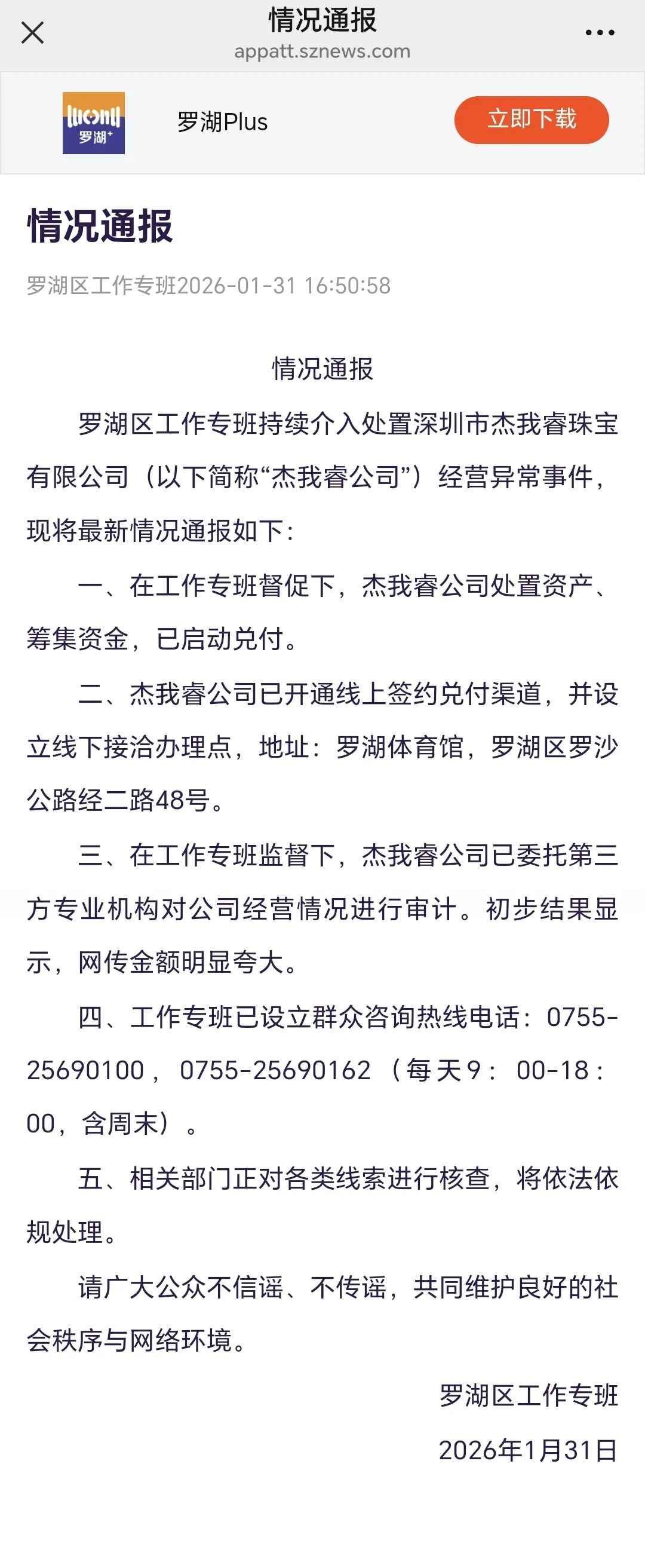 深圳新闻网消息,1月31日,罗湖区工作专班再发情况通报: 近日,深圳罗湖区企业深圳市杰我睿珠宝有限公司(以下简称"杰我睿")经营异常,引发关注。 罗湖区工作专班持续介入处置深圳市杰我睿珠宝有限公司(以下简称杰我睿公司)经营异常事件,现将 最新情况通报如下: 三、在工作专班监督下,杰我睿公司已委托第三方专业机构对公司经营情况进行审计。初步结果显示, 网传金额明显夸大。 四、工作专班已设立群众咨询热线电话:0755-25690100,0755-25690162(每天9:00-18:00,含周 末)。 五、相关部门正对各类线索进行核查,将依法依规处理。 请广大公众不信谣、不传谣,共同维护良好的社会秩序与网络环境。 一、在工作专班督促下,杰我睿公司处置资产、筹集资金,已启动兑付。 二、杰我睿公司已开通线上签约兑付渠道,并设立线下接洽办理点,地址:罗湖体育馆,罗湖区罗沙公 路经二路48号。 ...