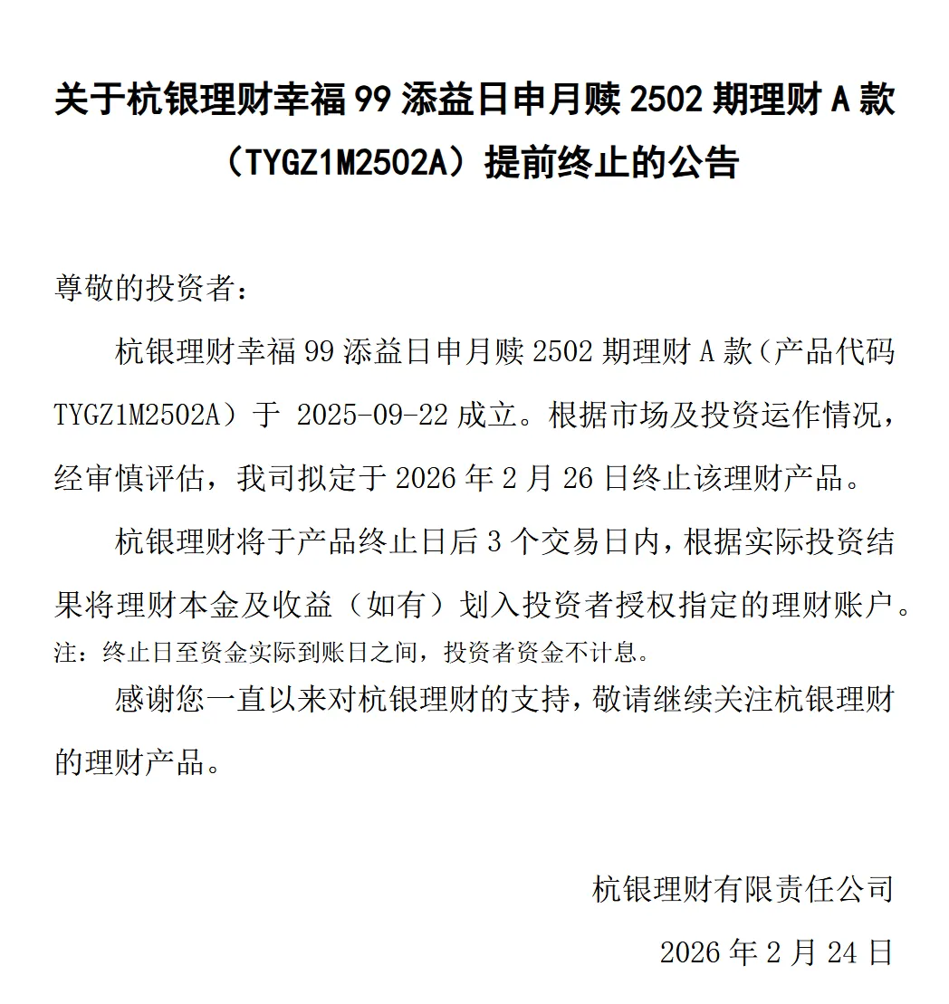 2月24日,杭银理财发布公告称,杭银理财幸福99添益日申月赎2502期理财A款(产品代码TYGZ1M2502A)于2025-09-22成立。根据市场及投资运作 情况,经审慎评估,该公司拟定于2026年2月26日终止该理财产品。 (杭银理财) ...