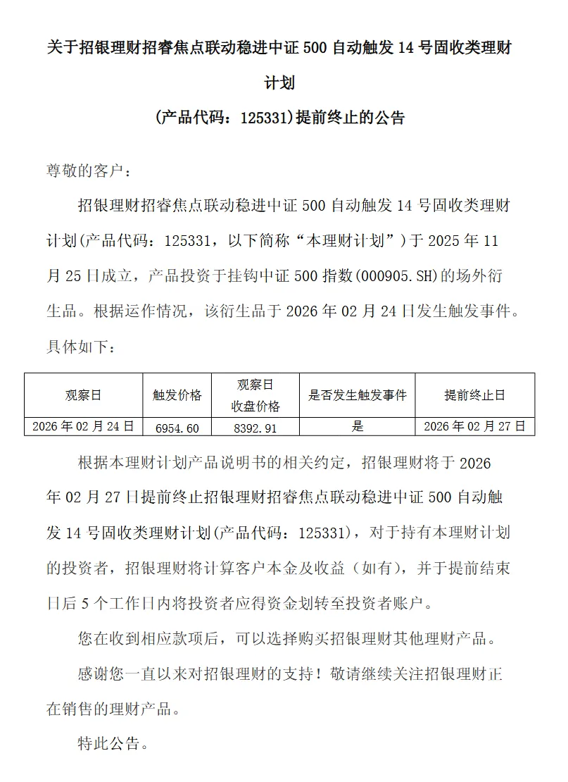 2月25日,招银理财发布公告称,招银理财招睿焦点联动稳进中证500自动触发14号固收类理财计划(产品代码: 125331)于2025年11月25日成立,产品投资于挂钩中证500指数(000905.SH)的场外衍生品。根据运作情况,该 衍生品于2026年2月24日发生触发事件。触发价格6954.60,观察日收盘价格8392.91。 根据该理财计划产品说明书的相关约定,招银理财将于2026年2月27日提前终止招银理财招睿焦点联动稳进中证 500自动触发14号固收类理财计划(产品代码:125331)。 (招银理财) | 观察日 | 触发价格 | 观察日 | 是否发生触发事件 | 提前终止日 | | --- | --- | --- | --- | --- | | | | 收盘价格 | | | | 2026年02月24日 | 6954. 60 | 8392. 91 | 是 | 2026年02月27日 | ...