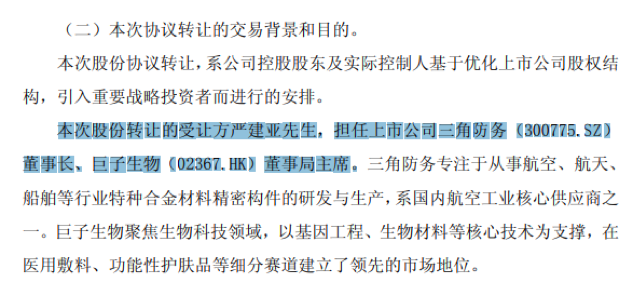 以三人行12月1日收盘价31.19元/股计算,此次转让单价较市价折价约14.2%。本次权益变动完成后,严 建亚将成为三人行控股股东及其一致行动人之外的第二大股东。 三人行表示,此次股份转让系公司控股股东及实际控制人基于优化上市公司股权结构,引入重要战略投 资者而进行的安排。 跃升为三人行第二大股东 严建亚为资本市场"熟客"。他与配偶范代娣共同控制着三角防务和巨子生物(02367.HK)两家上市公 司。其本人担任三角防务董事长、巨子生物董事局主席。 三角防务(300775)董事长严建亚拟以4.51亿元,受让三人行(605168)8%的股份,进而跃居三人行 第二大股东。 图片来源:公司公告 12月1日晚,三人行公告披露,公司控股股东青岛多多行投资有限公司(简称"青岛多多")、实际控制 人钱俊冬、崔蕾及一致行动人北京华软新动力私募基金管理有限公司(代表"新动力大运量化FOF2号私 募证券投资基金")(简称"华软动力")与严建亚签署了《股份转让协议》。协议约定,转让方拟将其 合计持有的约1686.54万股公司无限售条件流通股,以26.76元/股的价格协议转让给严建亚,转让总价款 合计约4.51亿元。 本次入股三人行, ...