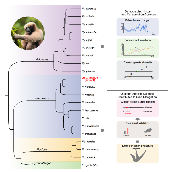 Core Insights - The research led by the Kunming Institute of Zoology has successfully unraveled the evolutionary relationships, endangered history, and genetic basis of the gibbon phenotype, providing scientific support for species conservation [2][3] Group 1: Research Findings - The study utilized advanced genomic techniques to construct the most comprehensive gibbon genome dataset to date, covering 18 extant gibbon species and three ancient samples, including the extinct "Gentle Gibbon" [2] - The research established the evolutionary sequence of the four major gibbon genera, resolving a century-long classification dispute and confirming the "Gentle Gibbon" found in the tomb of Emperor Qin's grandmother belongs to the Hoolock genus [3] - Genetic analysis indicated that most gibbons experienced a population bottleneck during the Late Pleistocene, approximately 100,000 to 200,000 years ago, with a synchronous recovery around 70,000 years ago, closely linked to global climate changes [3] Group 2: Genetic Mechanisms - The study identified a specific deletion in the SHH gene regulatory region, which is crucial for the long-limbed "brachiation" characteristic of gibbons, revealing the core genetic mechanisms behind the evolution of gibbon traits [3] Group 3: Future Implications - This research is a significant achievement in the international "Primate Genome Project" initiated by the Kunming Institute of Zoology, which will continue to provide a high-throughput, precise research platform for life sciences in China and globally, aiding in biomedicine development and biodiversity conservation [4]