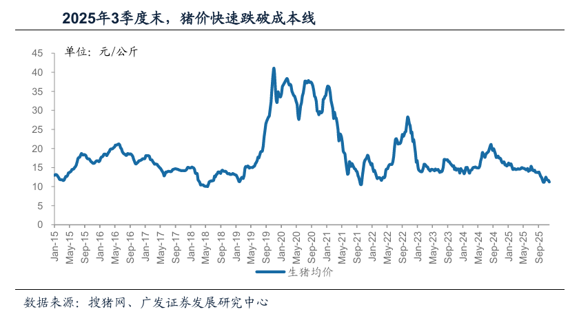 每经记者|闫峰峰 每经编辑|吴永久 2025年,我国生猪养殖行业在供需失衡、价格低迷和亏损扩大的困境中持续磨底。然而,政策引导与市场力量正共同倒 逼产能加速去化,行业格局面临深刻重塑,而生猪养殖企业也正面临行业周期底部和估值底部的双重局面。 行业现状:供给量高位震荡且亏损扩大 2025年,生猪供给量总体维持高位,加剧了市场供需矛盾。根据农业农村部数据,2025年前三季度全国生猪出栏量达 5.30亿头,同比小幅增长1.85%,处于近五年同期次高水平(仅低于2023年)。2025年三季度末,全国生猪存栏43680万 头,同比增加986万头,增长2.3%,环比增加1233万头,增长2.9%。 生猪产能高位震荡的核心在于能繁母猪存栏量仍高于合理水平。广发证券研报数据显示,截至2025年9月末,全国能繁 母猪存栏量为4035万头,较3900万头的合理保有量仍高出3.5%,供给压力尚未缓解。 供给过剩导致猪价全年震荡下行。申万宏源证券研报显示,本轮猪周期自2024年三季度见顶后开始下行,2025年全年猪 价震荡向下,猪价自年初的15元~16元/kg跌至四季度的11元~12元/kg左右。 随着猪价跌破成本线,养殖盈利转入亏 ...