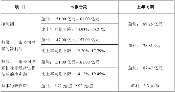 登录新浪财经APP 搜索【信披】查看更多考评等级 一、本期业绩预计情况 1、业绩预告期间:2025年1月1日—2025年12月31日 2、预计的业绩:□亏损 □扭亏为盈 □同向上升 √同向下降 | 项目 | 本报告期 | 上年同期 | | --- | --- | --- | | 净利润 | 盈利: 151.00 亿元-161.00 亿元 | 盈利:189.25 亿元 | | | 比上年同期下降:14.93%-20.21% | | | 归属于上市公司股 | 盈利:147.00 亿元-157.00 亿元 | 盈利: 178.81 亿元 | | 东的净利润 | 比上年同期下降:12.20%-17.79% | | | 归属于上市公司股 东扣除非经常性损 | 盈利: 151.00 亿元-161.00 亿元 | 盈利:187.47 亿元 | | 益后的净利润 | 比上年同期下降:14.12%-19.45% | | | 基本每股收益 | 盈利:2.73元/股-2.93元/股 | 盈利:3.3元/股 | 二、与会计师事务所沟通情况 1、公司就本期业绩预告与会计师事务所进行了预沟通,公司与会计师事务所在本期业绩预告方面不存 在 ...