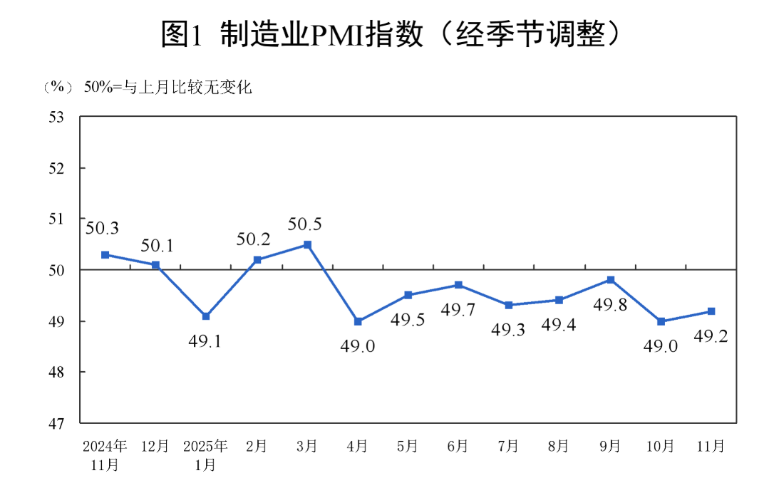 随着稳增长政策不断落地见效,以及10月末中美经贸会谈取得积极成果,国家统计局11月30日发布的11月份中国制造业采购经理指数(PMI)亦呈改善趋 势,49.2%的数值比10月提升0.2个百分点,但已连续8个月位于荣枯线之下。 (图表来源:国家统计局) 其中,11月份生产指数和新订单指数分别为50.0%和49.2%,比上月上升0.3个和0.4个百分点,其中生产指数升至临界点,制造业产需两端均有改善。而高技 术制造业PMI为50.1%,连续10个月位于临界点以上,相关行业继续保持增长。 中国物流与采购联合会特约分析师张立群表示,11月份制造业PMI指数小幅回升,表明市场信心有所改善。"十五五"发展目标鼓舞人心,对市场信心产生积 极影响。同时也要注意到制造业PMI指数仍处于荣枯线之下,市场引导的需求收缩仍比较突出,经济仍有下行压力。 张立群认为,要围绕"十五五"良好开局进一步加强宏观经济政策逆周期调节力度,显著加大政府公共产品、公共服务投资规模,有效有力带动企业订单增 加,尽快扭转市场引导的需求收缩发展趋势。 制造业稳中有升 11月份,生产经营活动预期指数为53.1%,比10月上升0.3个百分点,制造业企业对近期市 ...