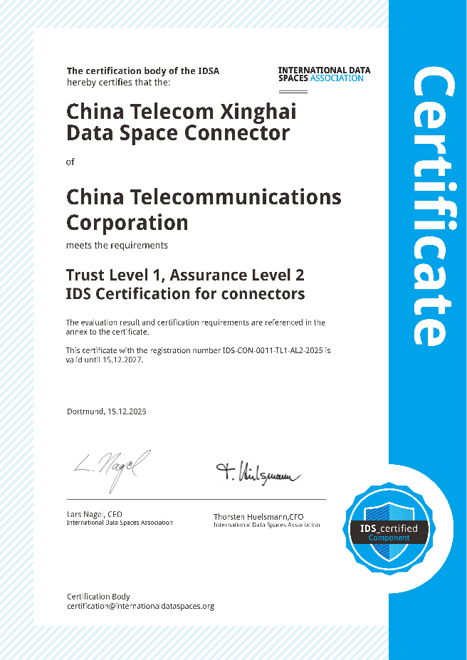 近日,中国电信星海数据空间连接器在下一代互联网国家工程中心-IDS数据空间测试认证实验室顺利通 过评估,获得了由国际数据空间协会(IDSA)颁发的国际数据空间(IDS)组件认证。该成果标志着产 品在技术合规性、安全性与国际互操作性上符合了国际要求,实现了与国际数据空间标准的全面对齐, 同时还为国内数据空间生态的标准化建设提供了关键实践标杆。 The certification body of the IDSA hereby certifies that the: ERNATIONAL DATA China Telecom Xinghai Data Space Connector of China Telecommunications Corporation meets the requirements Dortmund, 15.12.2025 Lars Nagel, CEO International Data Spaces Association Certification Body certification@internationaldataspaces.org ssifica Thorsten Hue ...